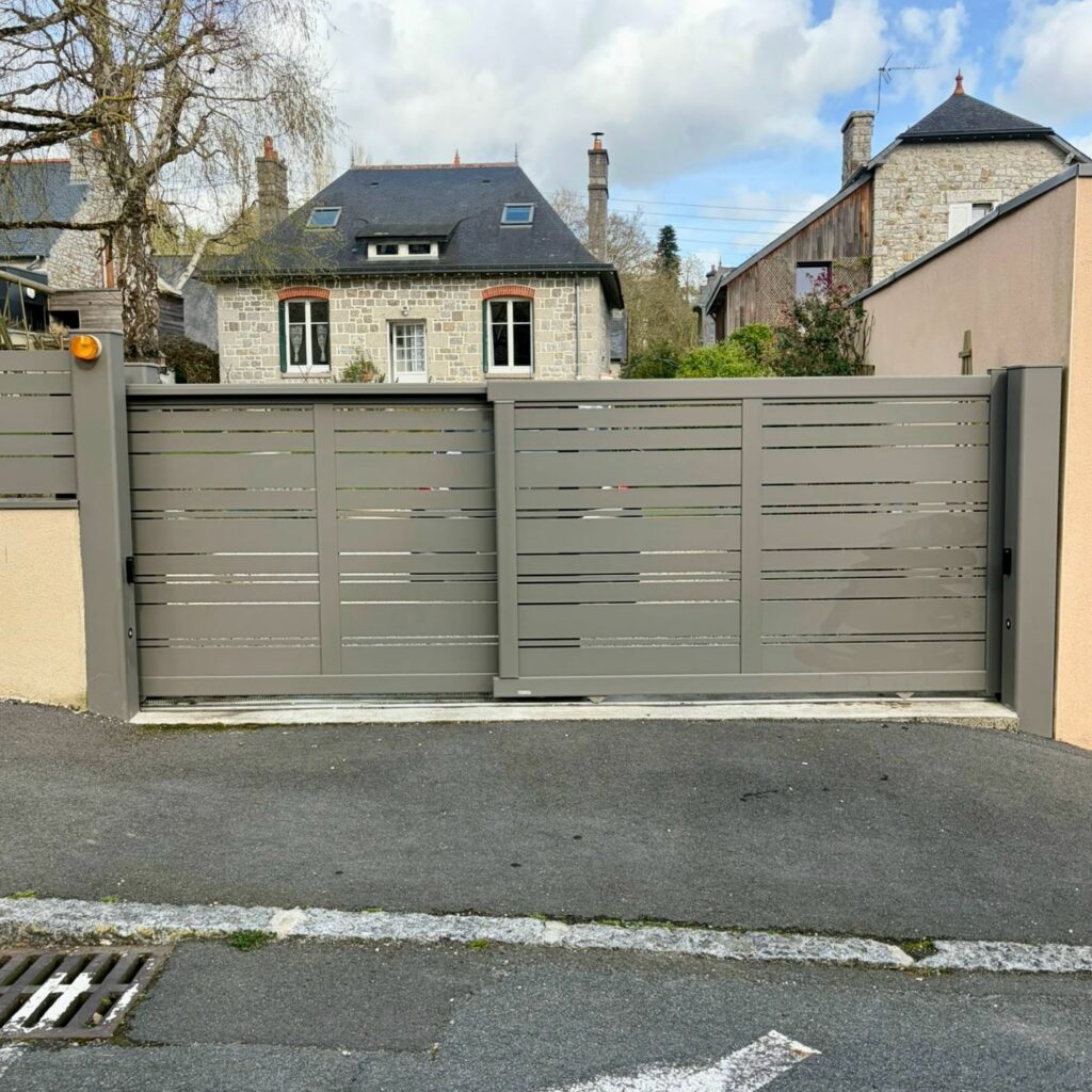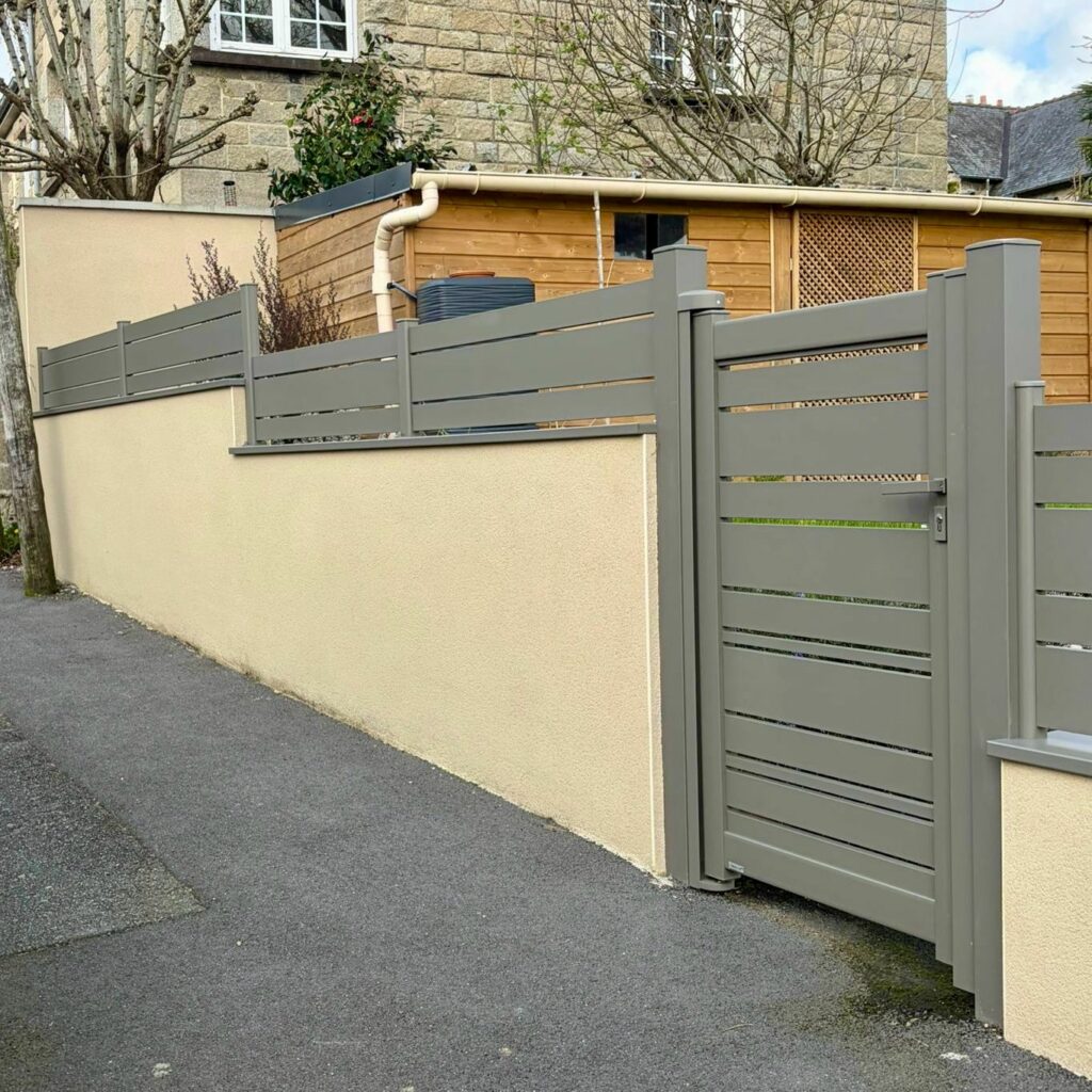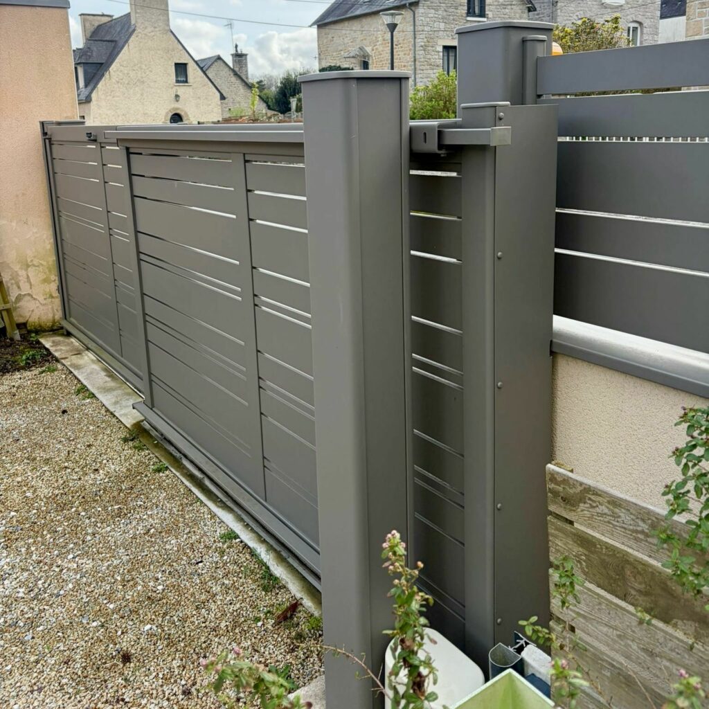 Sur ce chantier, nos équipes de Dinan ont assuré la pose complète d’un ensemble clôture, portail coulissant télescopique et portillon Kostum | Maison Cadiou pensé pour s’intégrer parfaitement à l’extérieur de nos clients.