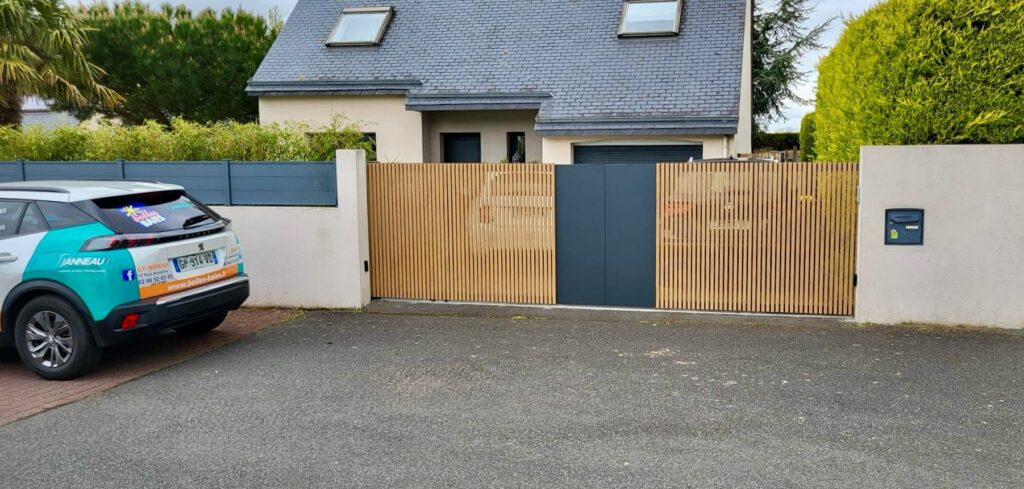 Présentation d’un portail coulissant motorisé signé Kostum | Maison Cadiou modèle THIA en RAL 7016, avec un barreaudage aluminium Ton Bois Irlandais.